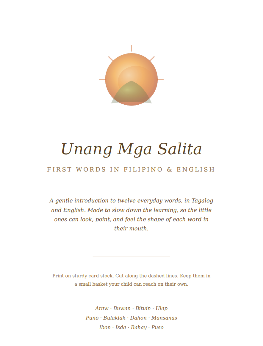 Twelve first-word cards in Tagalog and English, made to slow down the learning. Soft watercolour illustrations, warm amber tones, and simple everyday words your little one can say before they can read. Printable PDF, ready to trim and keep in a small basket your child can reach on their own.
